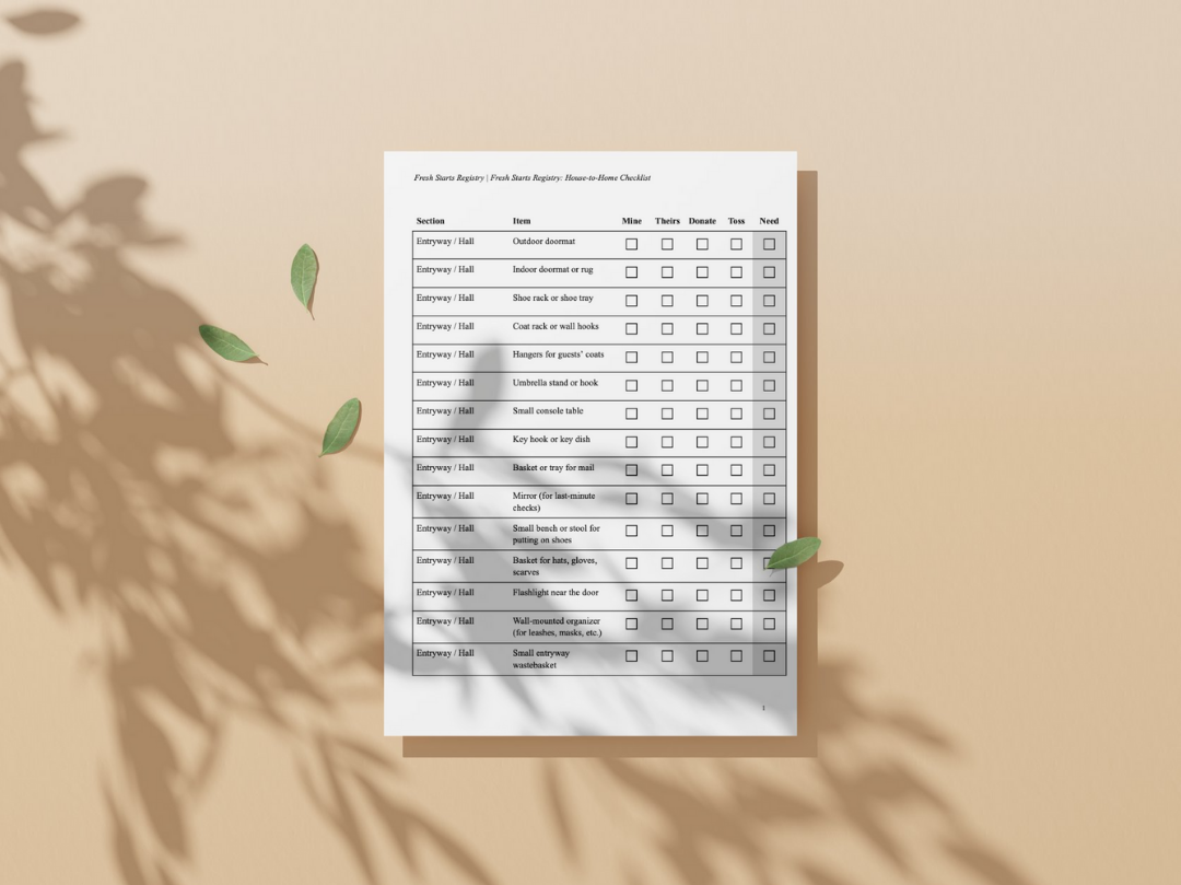 The Fresh Starts Registry: House-to-Home Checklist is a room-by-room guide to help you get clear on what you have, what’s leaving, and what you truly need as you rebuild your space after divorce. Take it one room at a time, marking each item as Mine, Theirs, Donate[d], Toss, or Need, and then use your “Need” column to build your registry or shopping list, your “Donate/Toss” columns to clear out old energy, and your “Theirs” column to stay organized for logistics and conversations.